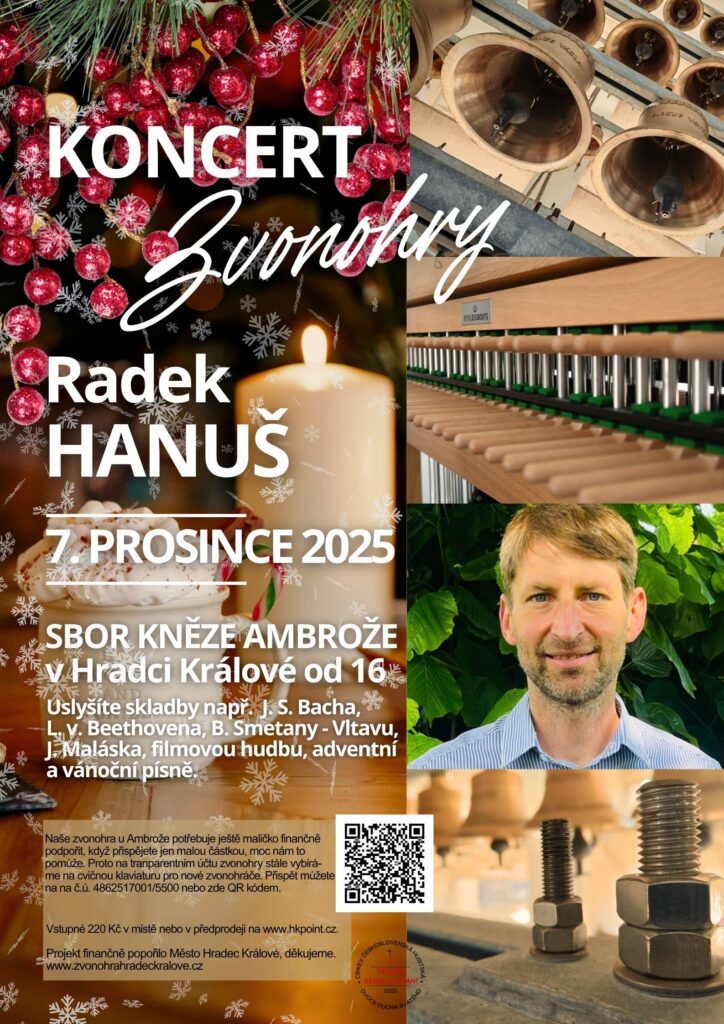 Zveme na adventní koncert zvonohry 7. prosince 2025. Radek Hanuš zahraje na koncertní zvonohru mj. skladby L. v. Beethovena, B. Smetany, J. S. Bacha, uslyšíte filmové, adventní a vánoční skladby. Zvonohra je umístěna ve věži Sboru kněze Ambrože Církve československé husitské a je složená z 50 zvonů, klaviatury a táhel. Zvonohráč – carillonér na nástroj hraje úhozy pěstí nebo malíkovou hranou, současně některé zvony ovládá nohama – pedály. Koncert se odehrává ve venkovních prostorách areálu, kde je také instalovaná obrazovka a diváci tak mohou carillonéra a jeho techniku hry sledovat. Zveme na koncert při svíčkách a horkém svařeném víně.