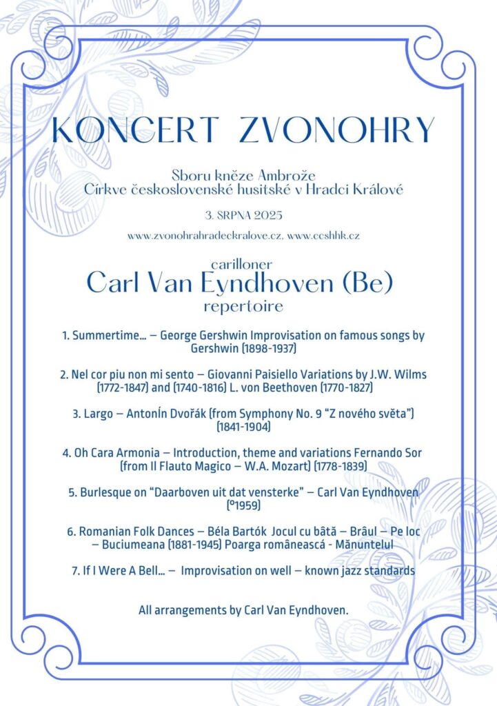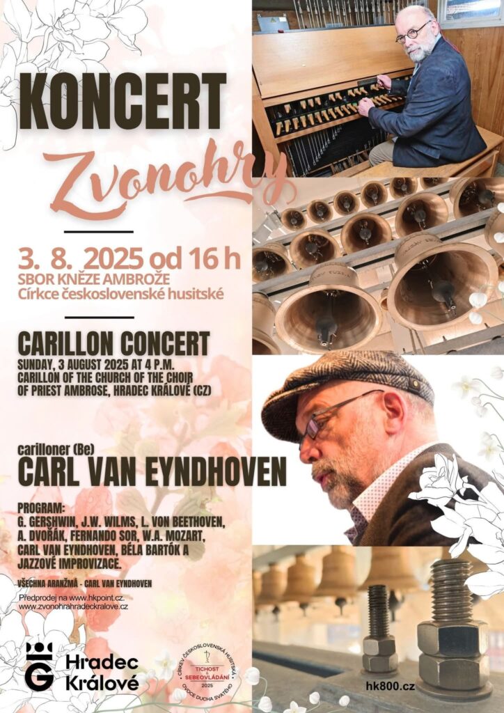 Vyslovujeme velké poděkování za výtečný koncert Carlu Van Eyndhovenovi. Všem, kteří jste si naši zvonohru přišli poslechnout a vstupným tak podpořit sbírku na cvičnou klaviaturu. Naše velké poděkování patří všem dobrým lidem, kteří nám pomohli s přípravou koncertu a úklidem stanů, židlí a všeho dalšího po koncertu. S chutí a úlevou, že vše dobře dopadlo, jsme si pak společně sedli, pili kávu, jedli dort a přemýšleli, čím příště koncert divákům vylepšit. Vedle hudebního zážitku byla i tato krátká chvíle pro nás velmi lidsky cenná a milá.